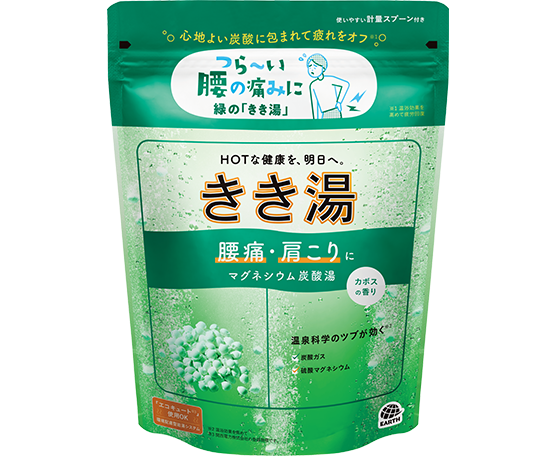 炭酸ガスと重曹が、温浴効果を高め血行を促進、「カサつく肌荒れ・しっしん」を緩和して、たまった疲労感をいやします。