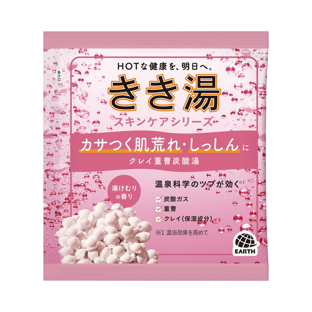 温泉科学のツブが効く*。温浴効果を高め、カサつく肌荒れ・しっしんを緩和。湯けむりの香り、乳白色のお湯(にごり)。 * 温浴効果を高めて疲労回復